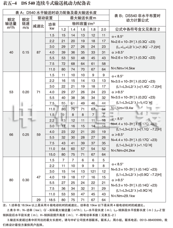 2、DS 540連續(xù)斗式輸送機動力配備表