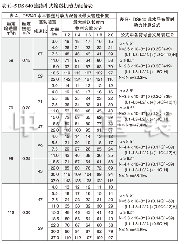 3、DS 640連續(xù)斗式輸送機動力配備表