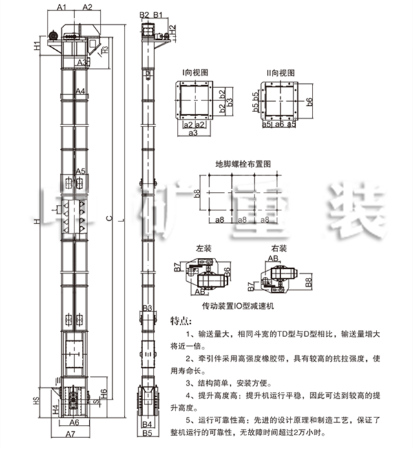 TD型斗式提升機(jī)適用于垂直輸送粉狀、粒狀,及小塊狀的磨琢性較小的散狀材料,如糧食、煤。水泥、碎礦石等,提升高度40m,其特點(diǎn)為結(jié)構(gòu)簡單,運(yùn)行平穩(wěn),挖取式裝料,離心式卸料,物料溫度普通膠帶不超過60℃,夾鋼絲膠帶可達(dá)80℃,耐熱膠帶可達(dá)120℃,與傳統(tǒng)D型斗提升機(jī)相比,輸送效率高,料斗型式多,應(yīng)優(yōu)先選用。