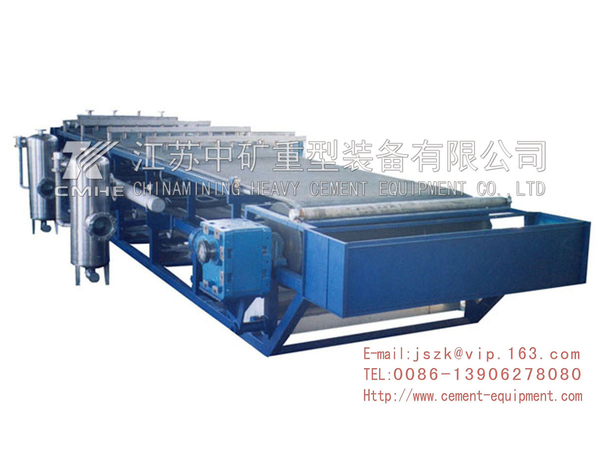 真空皮帶脫水機(jī)是一種用來分離固—液兩相組成的各種懸浮物的迅速過濾和脫水的高效分離設(shè)備。它主要由橡膠帶、驅(qū)動輥、張緊輥、真空室、進(jìn)料裝置、濾餅洗滌裝置、卸濾餅裝置、濾布糾偏裝置、濾布張緊裝置、驅(qū)動裝置,濾帶洗滌裝置、控制箱等組成。該機(jī)結(jié)構(gòu)先進(jìn),采用高強(qiáng)度的橡膠帶及濾布帶在機(jī)上既作環(huán)狀過濾帶,又作輸送帶。工作時物料由進(jìn)料裝置均布到移動的濾帶上,在真空作用下形成濾餅,依次經(jīng)過過濾、洗滌、脫水、卸餅、濾布和濾帶洗滌完成循環(huán)。